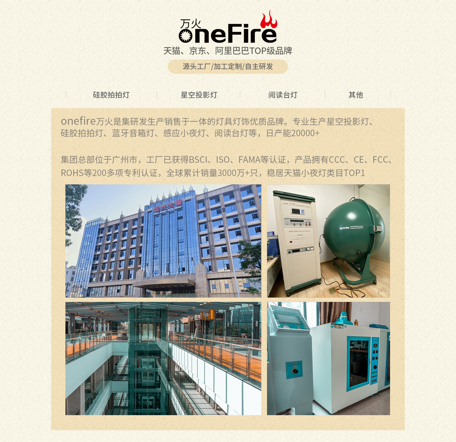 Onefire万火是一个集研发、生产、销售于一体的礼品类灯具灯饰品牌,专业生产星空投影灯、硅胶拍拍灯、蓝牙音乐灯、感应小夜灯、阅读台灯等,日产能20000+