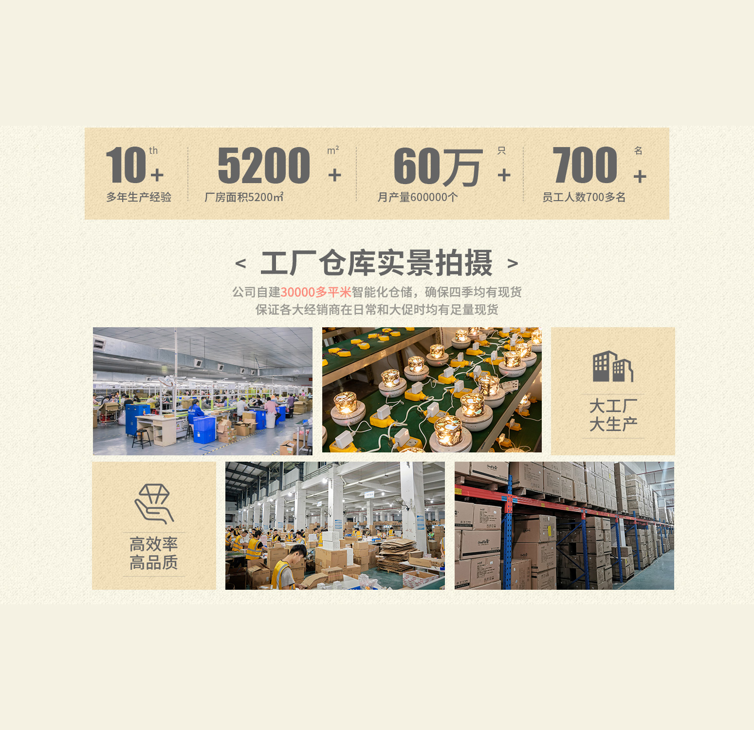 集团由专业运营团队、成熟的研发团队、品控团队、物流中心等核心部门组成,公司直营2家工厂员工共200多人。经过10年的深耕,万火已成长为灯具灯饰、礼品行业的顶级生产商,并因此成为国内外礼品公司的优质供应商。